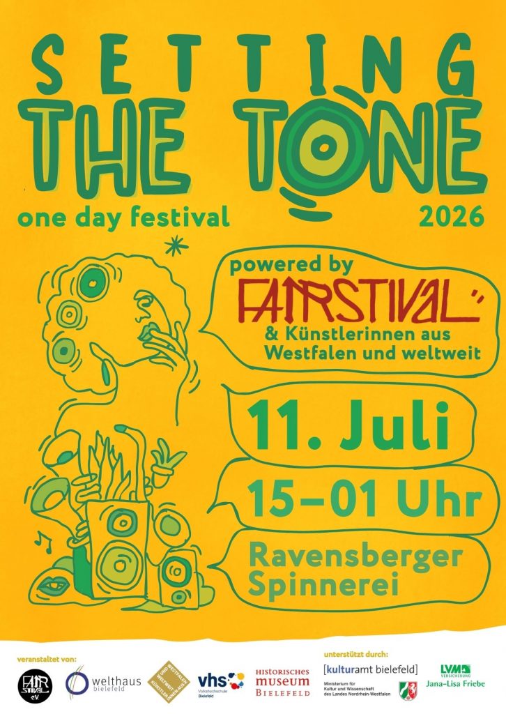 Das Fairstival bringt in Kooperation mit dem Welthaus im Rahmen des Projekts Künstlerinnen Westfalen weltweit eine Welle bunter Klänge nach Bielefeld. Auf dem diesjährigen Ein-Tages-Festival unter dem Namen „Setting the Tone“ wird der Ton von verschiedenen FLINTA*-Artists angegeben. Bei der Ravensberger Spinnerei entsteht ein Festivalgelände, was nicht nur mit den inneren Werten punkten kann: sowohl indoor als auch outdoor wird das historische Etablissement mit atmosphärischem Festivalflair verziert. Besuchende können sich auf auserlesene Bands und DJ*s, Essen und Getränke, Vorträge und Workshops sowie diverse Aktionen und Stände freuen